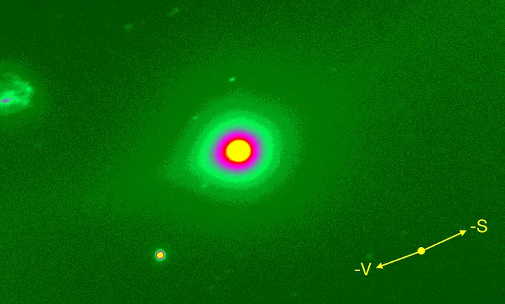 At the object’s current distance, this separation would amount to about 54,000 kilometers, which in the sky corresponds to 0.7 arcminutes—exactly the size seen in the luminous elongation. In other words, the tear-shaped form could literally be the luminous shadow of the swarm.